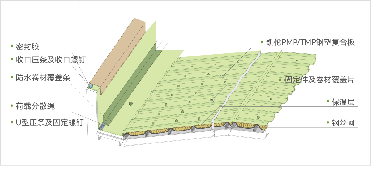 ? 將TPO、PVC卷材經特殊工藝和鍍鋅鋼板貼合為一體,將 剛性連接變?yōu)槿嵝蕴幚硌娱L金屬屋面的使用壽命